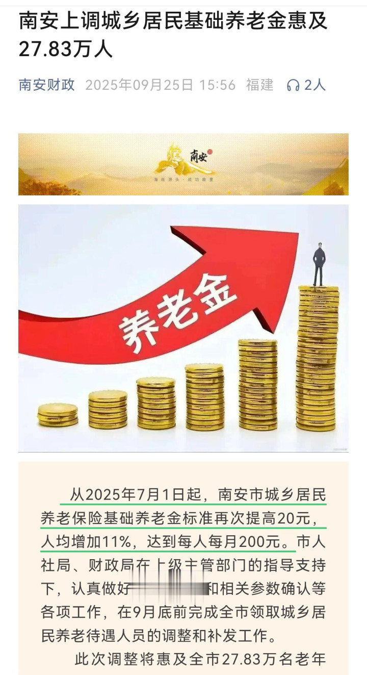 9月24日,福建南安市上调城乡居民基础养老金标准20元,达到每人每月200元。山东平原县增加20元,达到每人每月173元。25日,河北隆尧县也提高20元,每人每月达到198元。