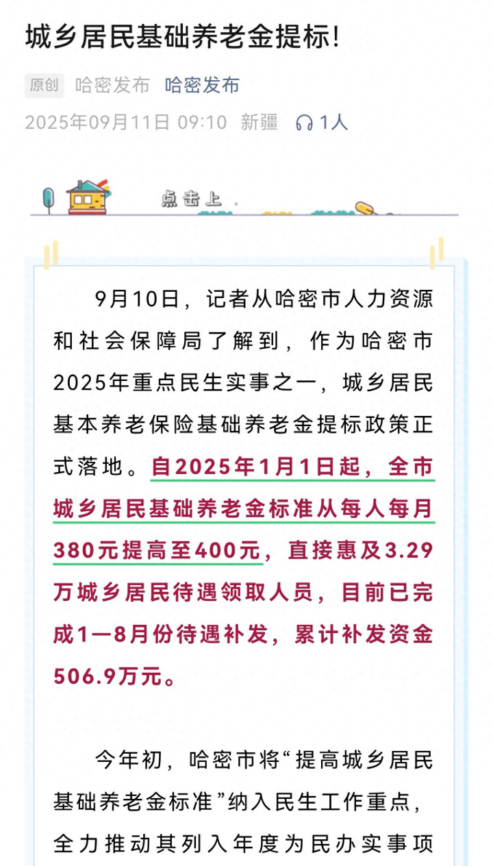 再说调整补发的月数,有些是从今年1月开始,补发8个月,有些是从7月开始,补发2个月。比如新疆哈密市说完成1—8月份待遇补发,也就是160元,9月份哈密市农民朋友可以收到560元基础养老金。